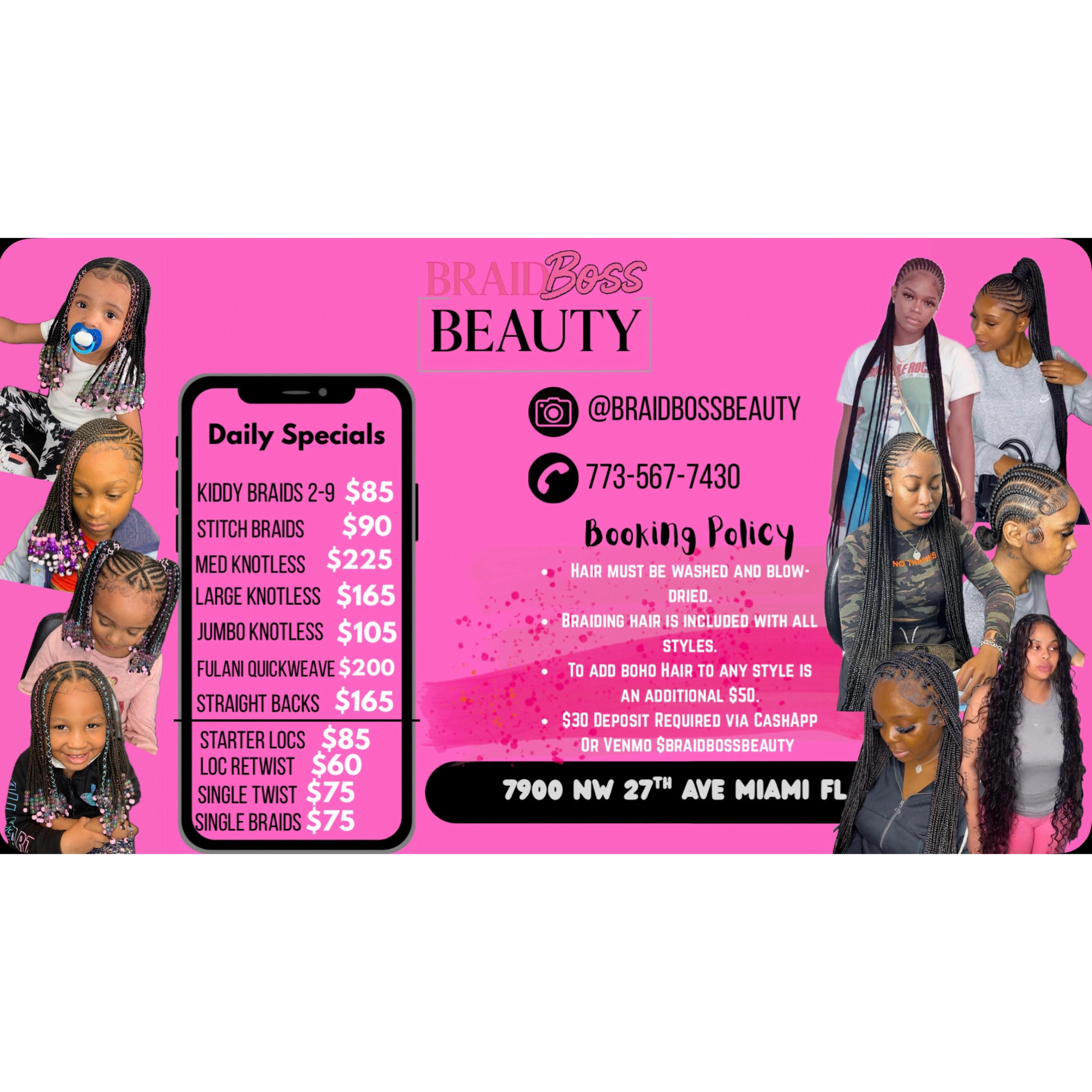“In addition to my mobile braiding services, Ive Decided To Give Back To My Community . I partnered With A local Miami Salon To provide exclusive daily specials For Limited Styles . To reserve your appointment for these specials, please TEXT Tavia"